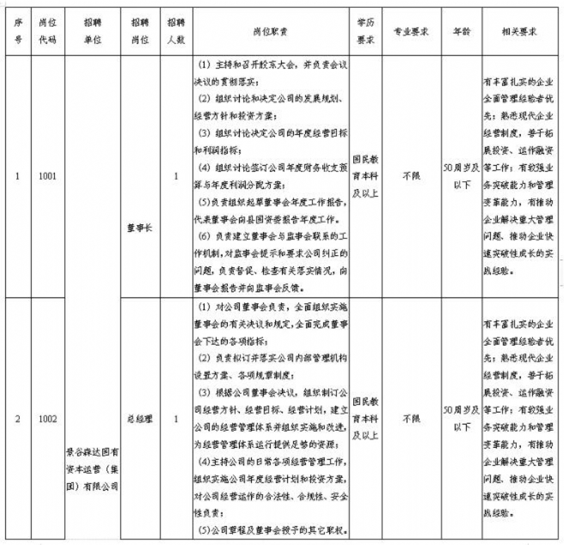 為扎實(shí)推進(jìn)縣屬國有企業(yè)人事制度改革,健全和完善市場(chǎng)化用工,根據(jù)《中華人民共和國公司法》、《中華人民共和國勞動(dòng)合同法》和《景谷傣族彝族自治縣國有企業(yè)改革發(fā)展三年行動(dòng)方案(2023—2025年)》要求,為進(jìn)一步推進(jìn)縣屬國有企業(yè)市場(chǎng)化轉(zhuǎn)型發(fā)展,加強(qiáng)人才隊(duì)伍建設(shè),實(shí)現(xiàn)人才強(qiáng)企戰(zhàn)略,滿足縣屬國企高質(zhì)量發(fā)展及業(yè)務(wù)擴(kuò)展需要,擬向社會(huì)公開招聘縣屬國企高級(jí)經(jīng)營管理人員。