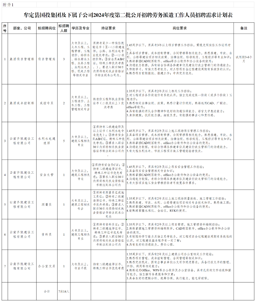 附件:1.牟定縣國投集團(tuán)及下屬子公司2024年度第二批公開招聘勞務(wù)派遣工作人員招聘需求計劃表