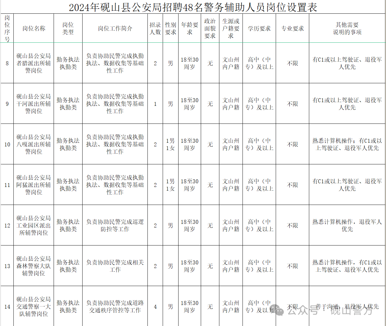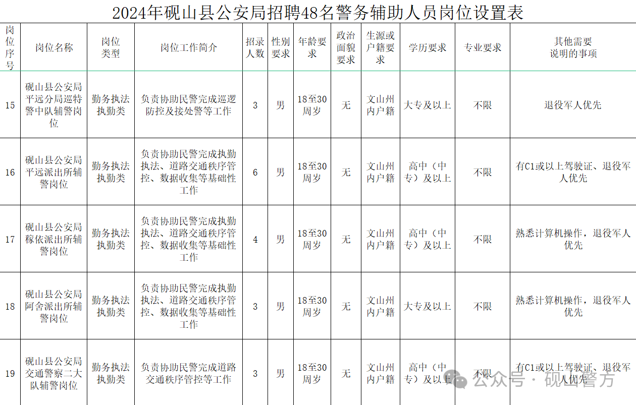 硯山縣公安局此次面向社會(huì)公開(kāi)招聘輔警48名。招聘崗位及人數(shù)詳見(jiàn)《硯山縣公安局招聘警務(wù)輔助人員崗位設(shè)置表》。