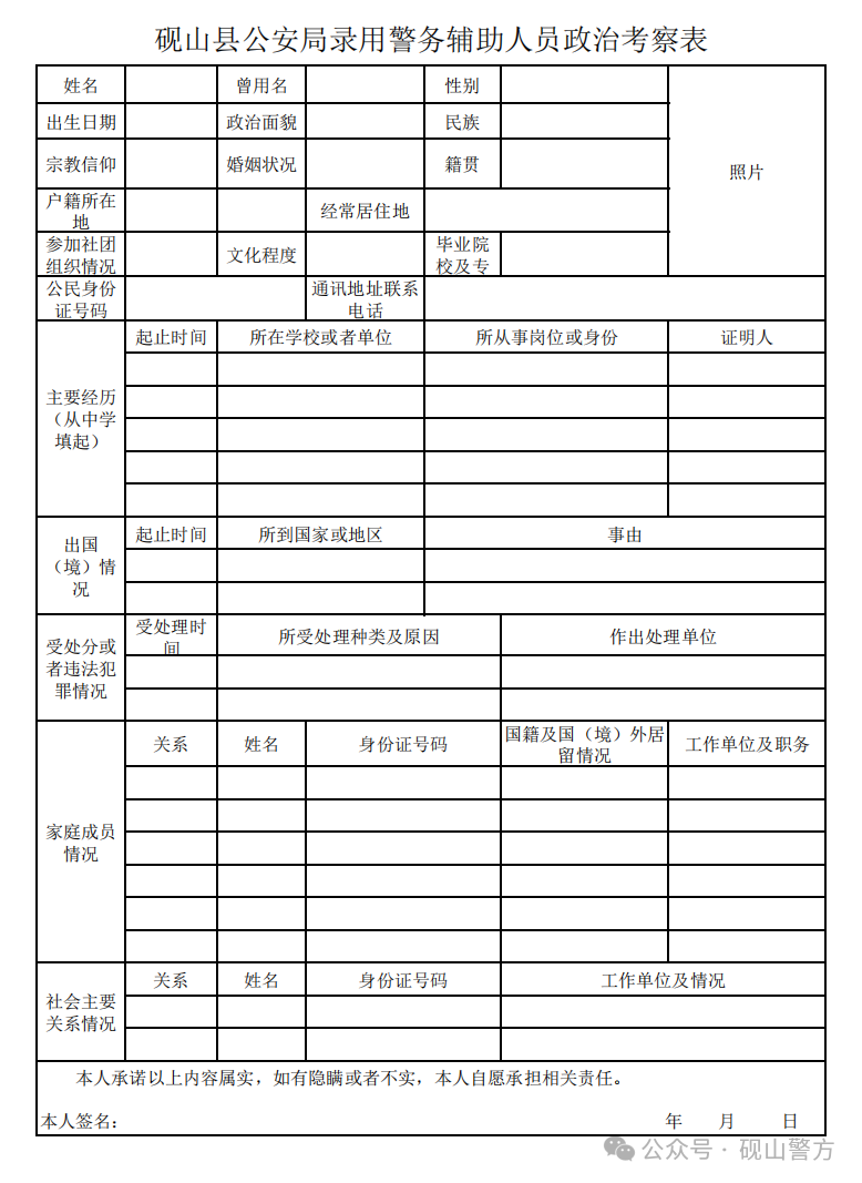 (4)真實(shí)完整填寫(xiě)好的《硯山縣公安局輔警招聘報(bào)名表》、《硯山縣公安局輔警招聘誠(chéng)信承諾書(shū)》、《硯山縣公安局錄用警務(wù)輔助人員政治考察表》;
