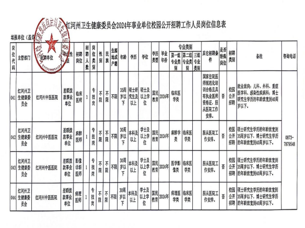 招聘崗位由招聘單位編報(bào),招聘專業(yè)、學(xué)歷等與崗位資格條件相關(guān)的問題,由招聘單位負(fù)責(zé)解釋。詳見《紅河州衛(wèi)生健康委員會(huì)2024年事業(yè)單位校園公開招聘工作人員崗位信息表》(附件1)。