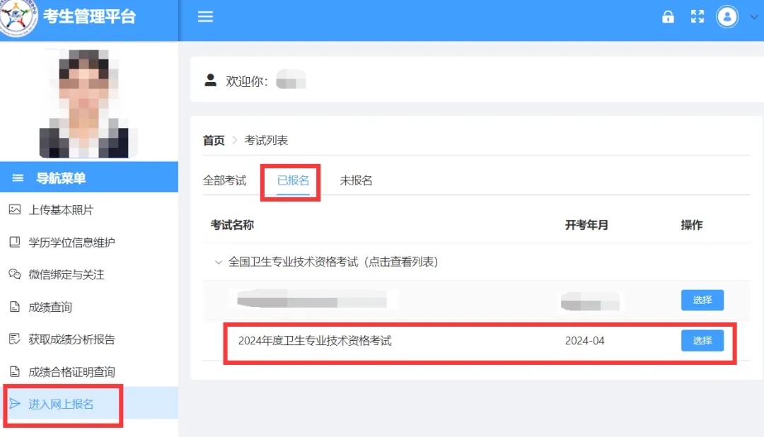登錄考生管理平臺后,點擊左側(cè)導航欄“進入網(wǎng)上報名”,在“已報名”考試列表中選擇考試項目。