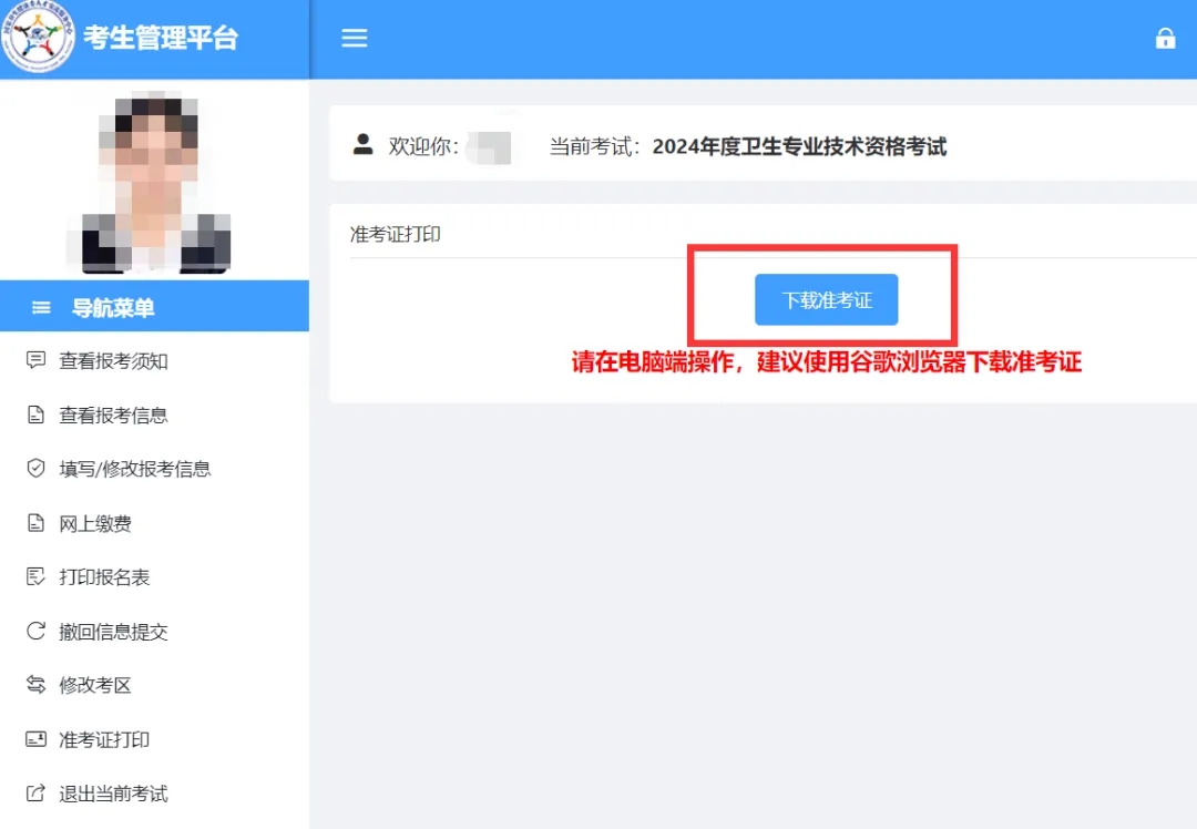 點擊“下載準考證”,并妥善保存。(請在電腦端操作,建議使用谷歌瀏覽器)