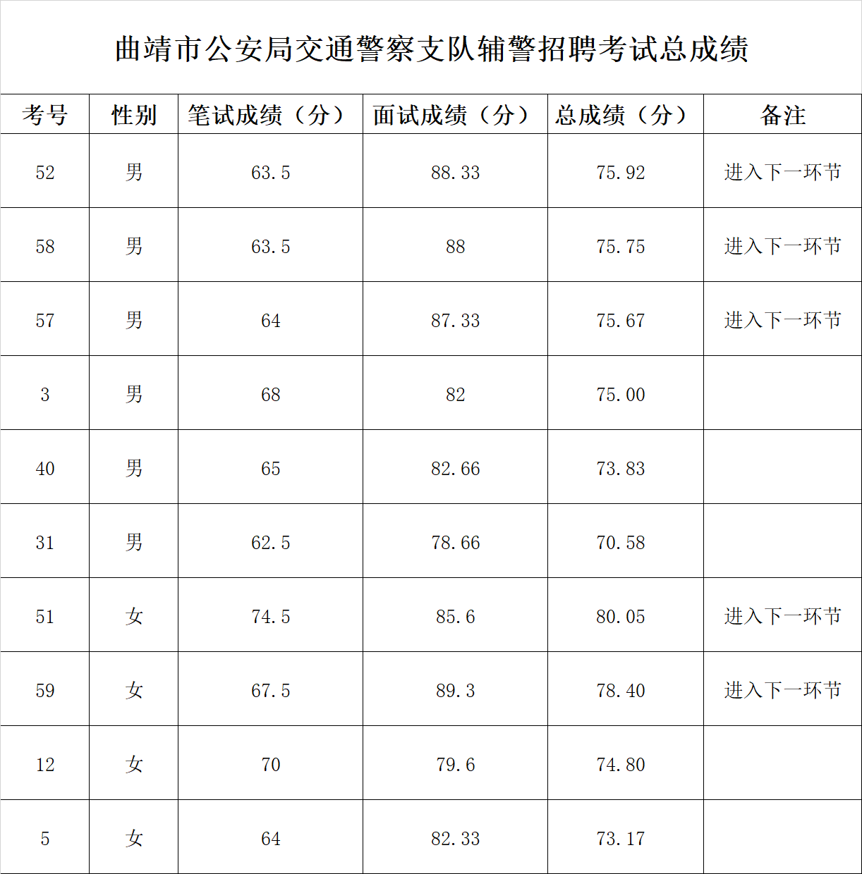 根據(jù)《曲靖市公安局交通警察支隊(duì)關(guān)于公開招聘輔警的公告》規(guī)定,經(jīng)過筆試和面試,現(xiàn)將2024年曲靖市公安局交警支隊(duì)公開招聘輔警總成績(jī)予以公布。按總成績(jī)由高到低的順序及招聘輔警人數(shù)要求,確定5名考生進(jìn)入下一環(huán)節(jié),請(qǐng)5名考生于4月7日15時(shí)在西關(guān)小學(xué)田徑場(chǎng)(曲靖青少年足球訓(xùn)練基地)集合,組織開展體能測(cè)試,逾期不到者視為放棄資格。