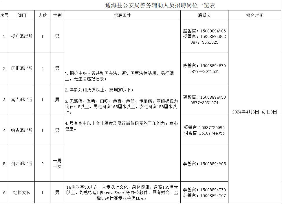 招聘|通海縣公安局招聘警務輔助人員10名 根據(jù)工作需要,通??h公安局面向社會公開招聘警務輔助人員10名,現(xiàn)將有關(guān)事項公告如下: 一、招聘崗位及聯(lián)系方式: