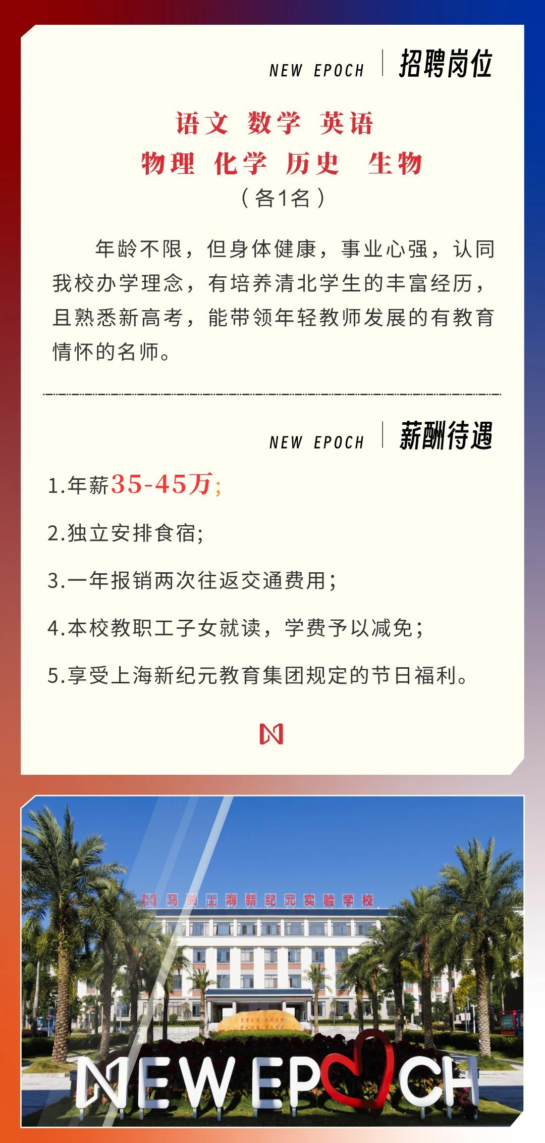 年薪35-45萬(wàn)誠(chéng)邀名師,馬關(guān)上海新紀(jì)元實(shí)驗(yàn)學(xué)校歡迎您的加入!