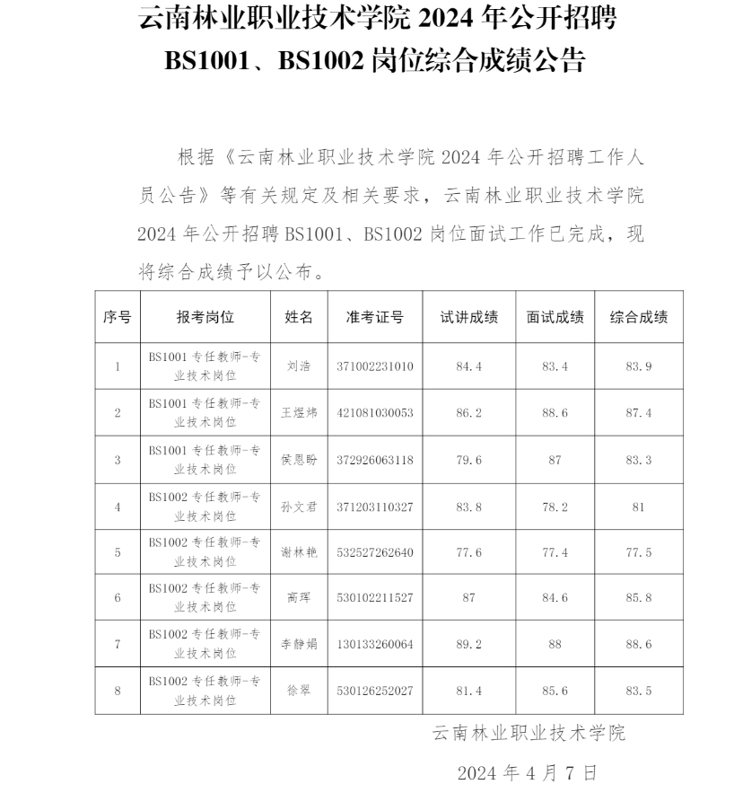 云南林業(yè)職業(yè)技術(shù)學院2024年公開招聘BS1001、BS1002崗位綜合成績公告