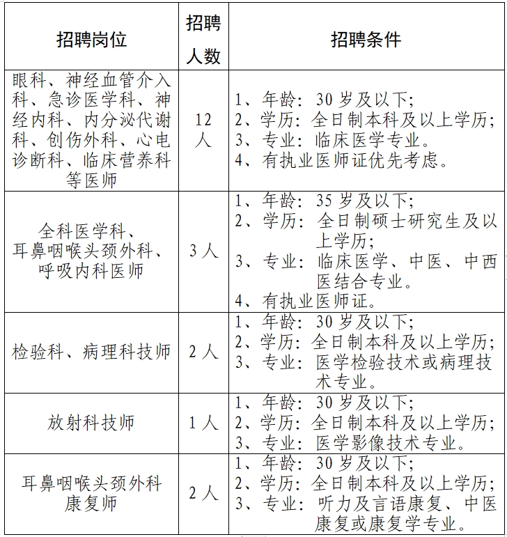 根據(jù)醫(yī)院業(yè)務(wù)發(fā)展需求,現(xiàn)需招聘編外工作人員20人,具體招聘條件如下: