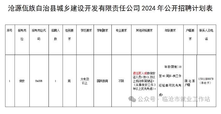 滄源佤族自治縣城鄉(xiāng)建設(shè)開發(fā)有限責任公司公開招聘1名專業(yè)人才,保安人員1名。招聘計劃詳見《滄源佤族自治縣城鄉(xiāng)建設(shè)開發(fā)有限責任公司2024年公開招聘計劃表》附件。