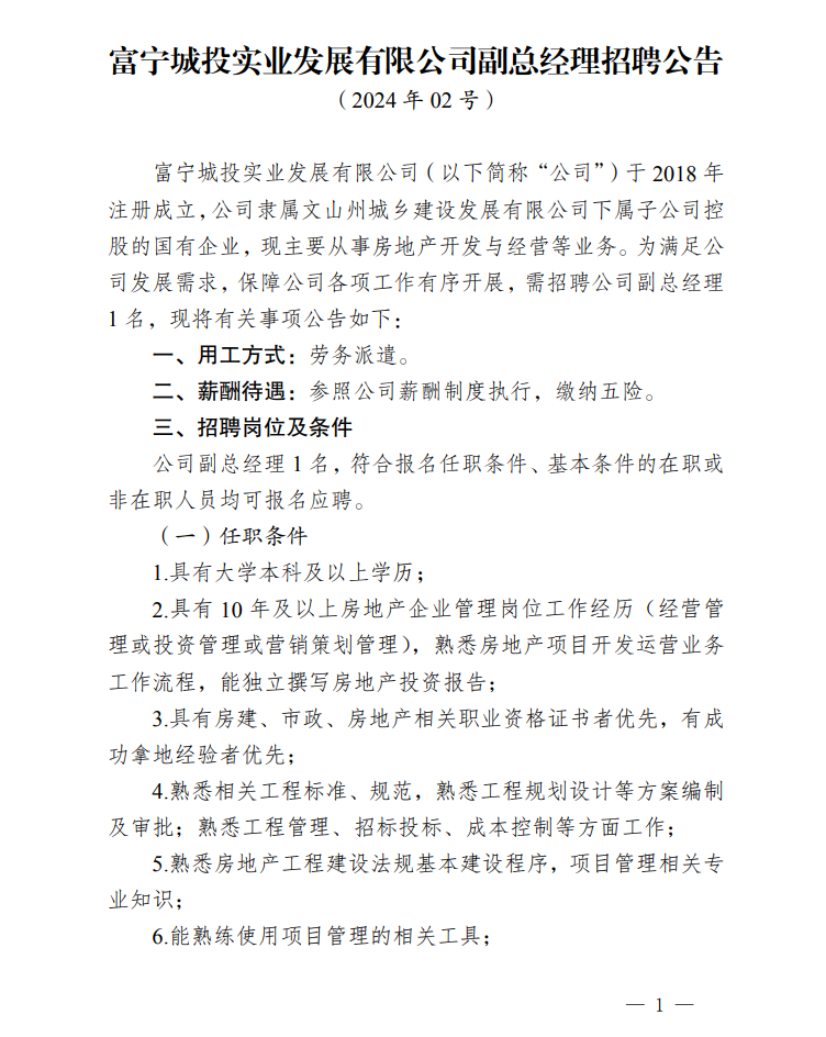 2024年文山州富寧城投實業(yè)發(fā)展有限公司副總經(jīng)理招聘公告
