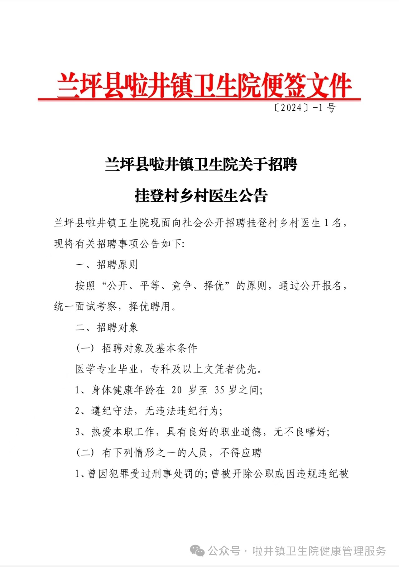 蘭坪縣啦井鎮(zhèn)衛(wèi)生院招聘掛登鄉(xiāng)村醫(yī)生公告