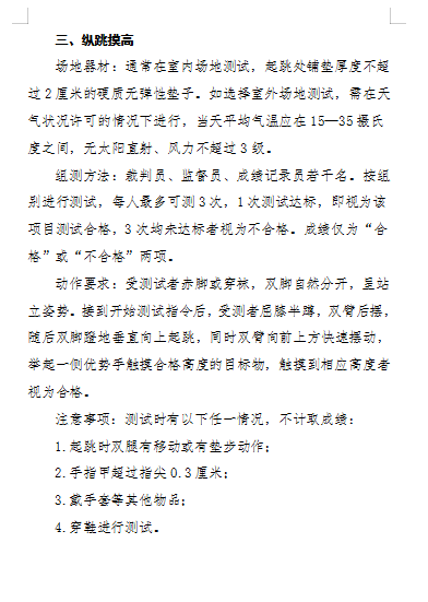 3.三個(gè)測(cè)評(píng)項(xiàng)目,每項(xiàng)均達(dá)標(biāo)者為合格。凡其中一項(xiàng)不達(dá)標(biāo)的,視為體能測(cè)評(píng)不合格。