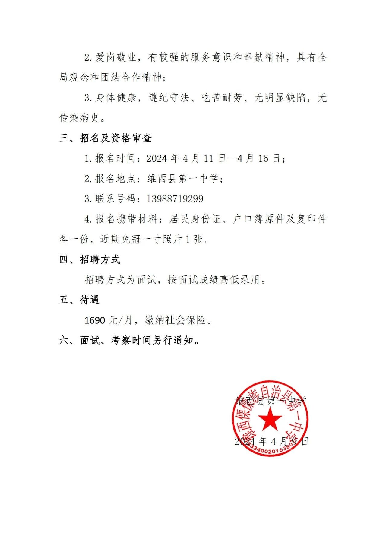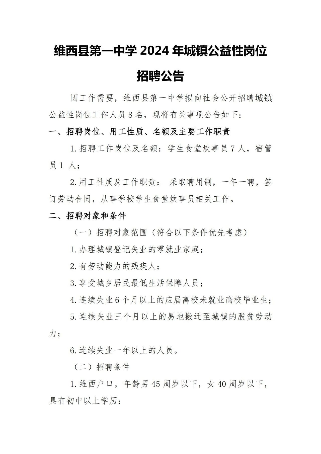 維西縣第一中學(xué)2024年城鎮(zhèn)公益性崗位招聘公告