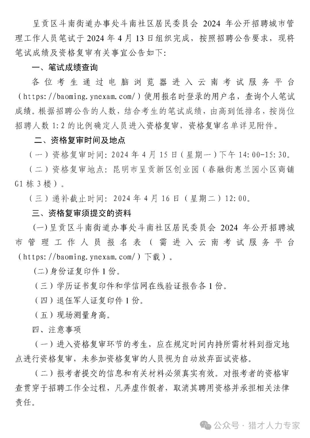2024年昆明市呈貢區(qū)斗南街道辦事處斗南社區(qū)居民委員會(huì)招聘筆試成績(jī)及資格復(fù)審公告