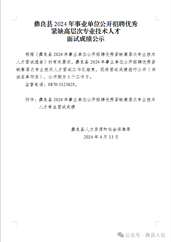 彝良縣2024年事業(yè)單位公開招聘優(yōu)秀緊缺高層次專業(yè)技術(shù)人才面試成績公示