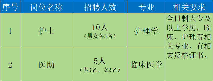 1.護(hù)士:護(hù)士需持有護(hù)士資格證;年齡32歲以下;全日制大專及以上學(xué)歷各屆畢業(yè)生、應(yīng)屆畢業(yè)生;身心健康,愛崗敬業(yè),服從領(lǐng)導(dǎo)安排。