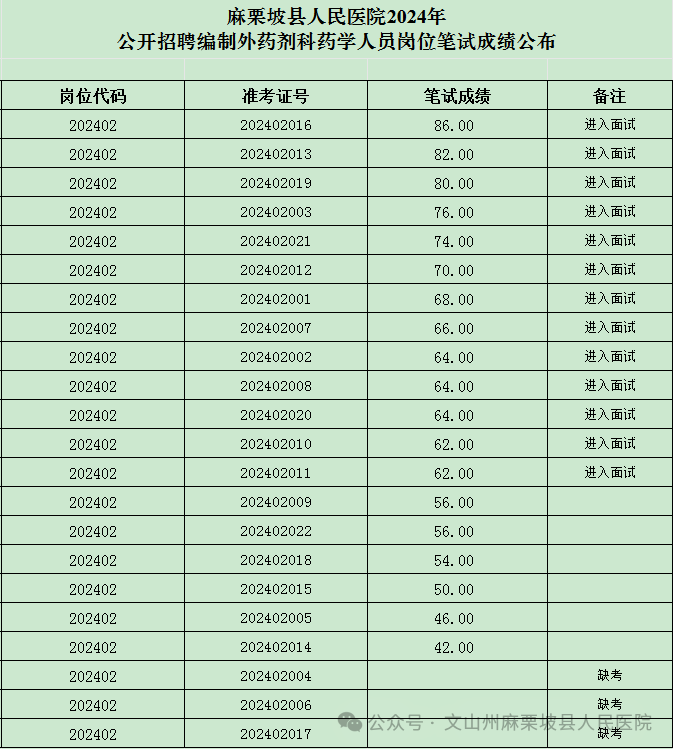 麻栗坡縣人民醫(yī)院2024年公開(kāi)招聘編制外藥劑科藥學(xué)人員崗位筆試成績(jī)公布
