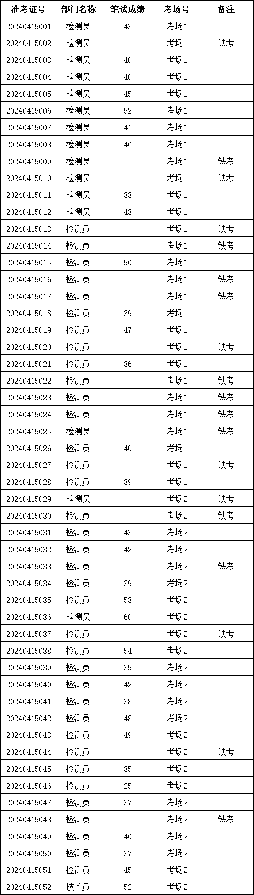 澄江市智謙建設(shè)工程質(zhì)量檢測有限公司2024年公開招聘工作人員筆試,于2024年4月15日結(jié)束,根據(jù)《澄江智謙建設(shè)工程質(zhì)量檢測有限公司2024年公開招聘工作人員公告》筆試成績滿分為100分,現(xiàn)將筆試成績名單公示如下: