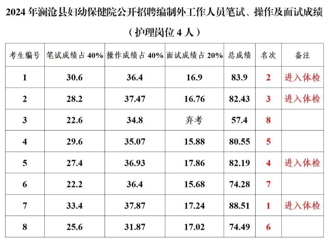 根據(jù)《瀾滄縣緊密型醫(yī)共體成員單位(婦幼保健院)2024年人才招聘公告》,4月11日、4月17日,瀾滄縣婦幼保健院在1號(hào)樓六樓進(jìn)行了人才招聘綜合筆試、技能操作考試及面試,現(xiàn)將2024年瀾滄縣婦幼保健院第一批公開(kāi)招聘編制外工作人員成績(jī)公示如下: