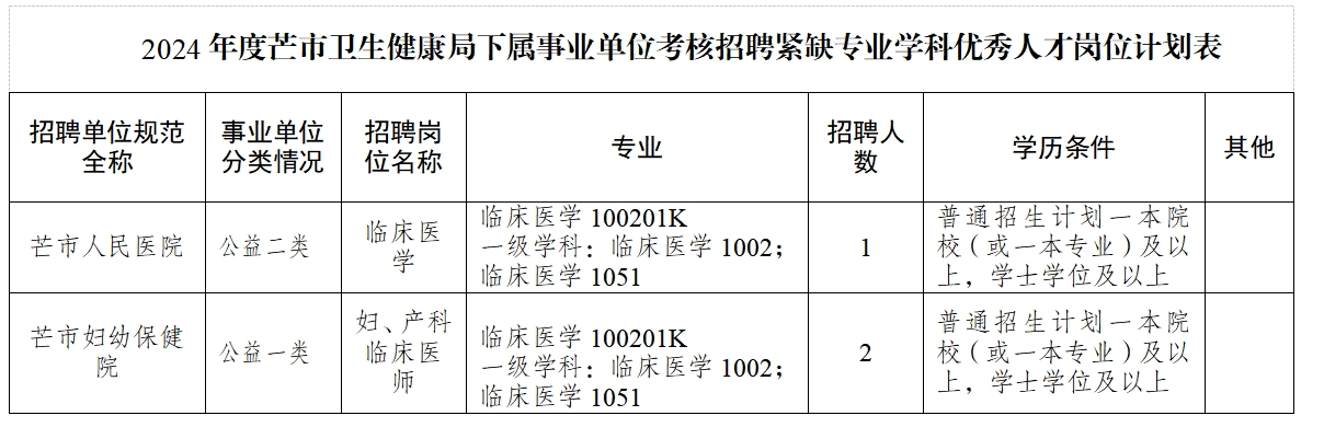 經(jīng)研究,現(xiàn)將2024年度芒市衛(wèi)生健康局下屬事業(yè)單位考核招聘緊缺專業(yè)學(xué)科優(yōu)秀人才(事業(yè)編制)相關(guān)事宜補充公告如下:
