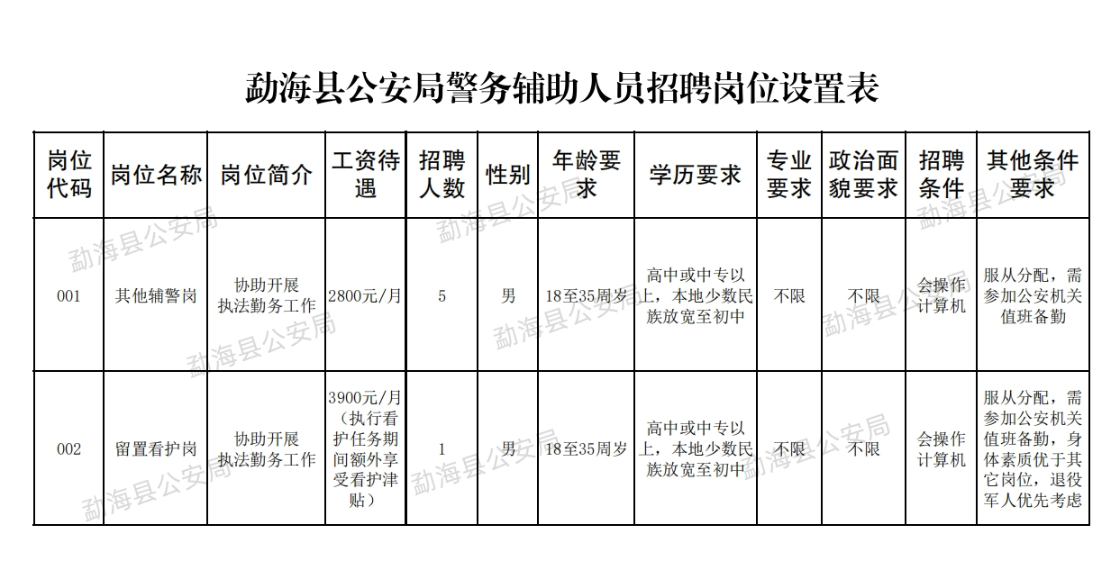本次共招聘輔警6人,主要在勐海縣公安局內(nèi)設(shè)機(jī)構(gòu)從事執(zhí)法勤務(wù)等工作。輔警不具有人民警察和公務(wù)員身份,不行使人民警察職權(quán)。具體崗位見下圖。