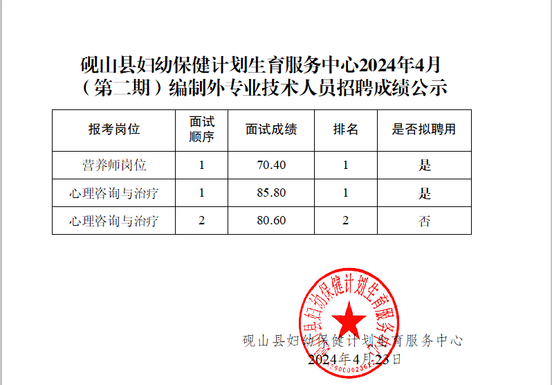 硯山縣婦幼保健院2024年4月(第二期)編制外專業(yè)技術(shù)人員招聘成績及擬聘用人員名單公示: