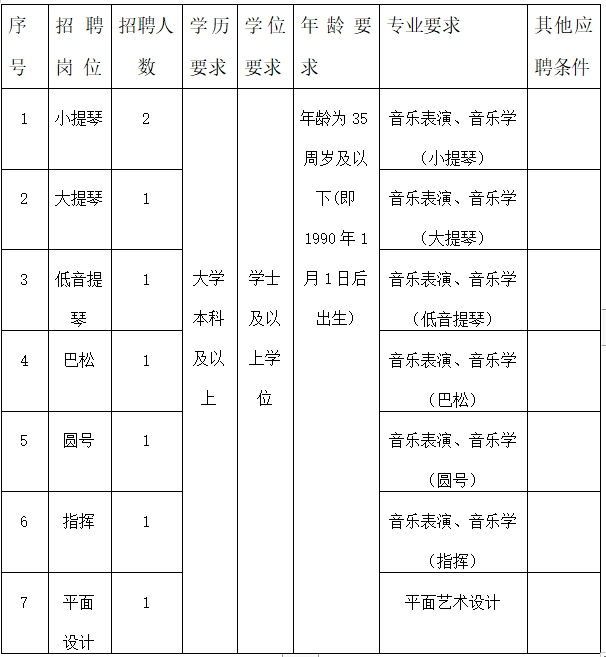 本次公開招聘編外聘用人員8名。其中,平面設(shè)計人員1名、演奏員7名(小提琴2名、大提琴1名、低音提琴1名、巴松1名、圓號1名、指揮1名)。具體招聘崗位及招聘條件,詳見《2024年昆明聶耳交響樂團公開招聘人員計劃表》(附件1)。本次招聘崗位不占用單位事業(yè)編制,用工形式為勞務(wù)派遣。