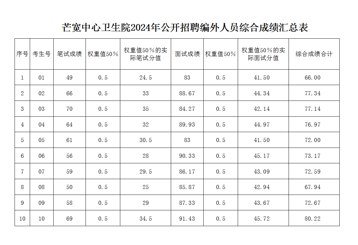 根據(jù)《隆陽區(qū)衛(wèi)生健康系統(tǒng)編外人員管理辦法(試行)》(隆衛(wèi)健發(fā)〔2022〕39號)相關(guān)要求,按照公平、公正、公開的原則,保山市隆陽區(qū)芒寬彝族傣族鄉(xiāng)中心衛(wèi)生院于2024年04月23日進(jìn)行筆試和面試工作,現(xiàn)將考生綜合成績予以公示。