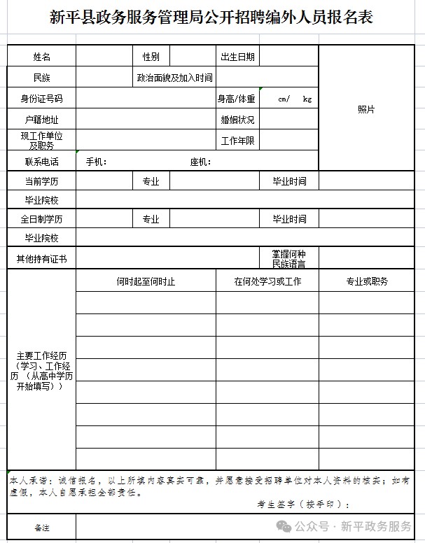 4.附:新平縣政務(wù)服務(wù)管理局公開招聘編外人員報名表。