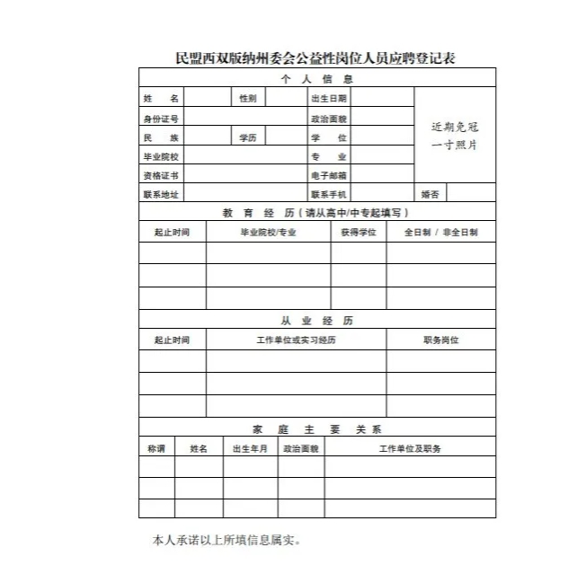 3.報(bào)名方式:將《民盟西雙版納州委會(huì)公益性崗位人員應(yīng)聘登記表》(見附件)發(fā)送至mmxsbn@163.com郵箱。