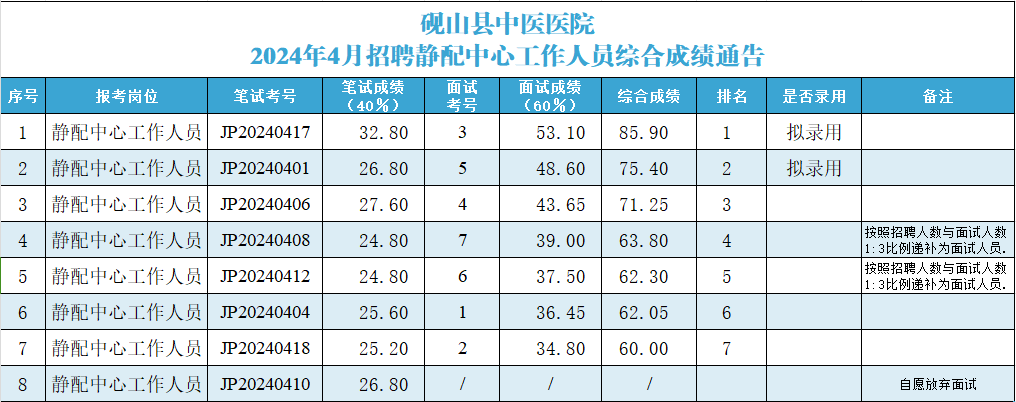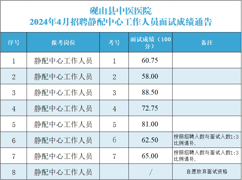 硯山縣中醫(yī)醫(yī)院2024年4月招聘靜配中心工作人員面試成績及綜合成績通告