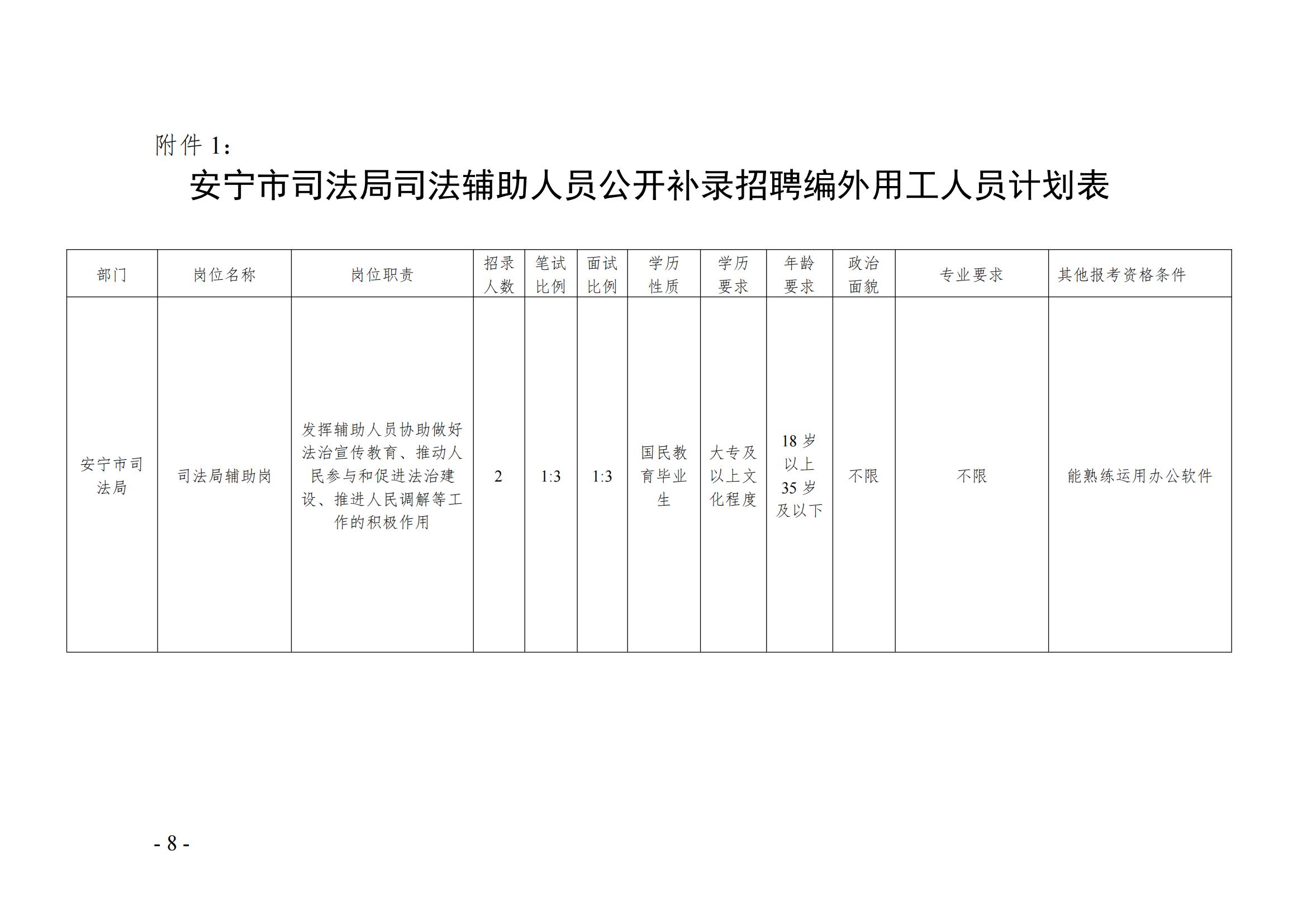 附件1:安寧市司法局司法輔助人員公開(kāi)補(bǔ)錄招聘編外用工人員計(jì)劃表。