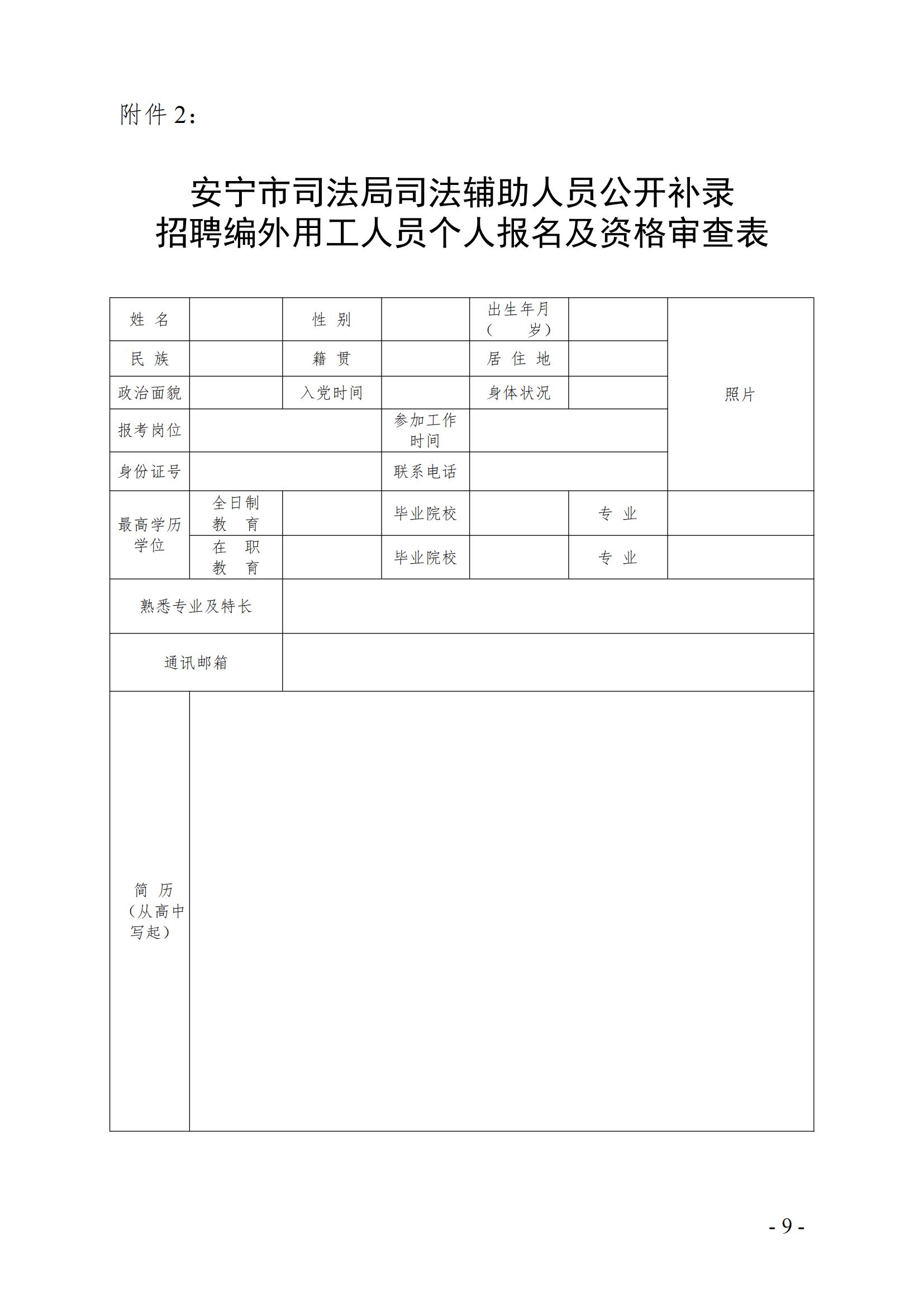 附件2:安寧市司法局司法輔助人員公開(kāi)補(bǔ)錄招聘編外用工人員個(gè)人報(bào)名及資格審查表。