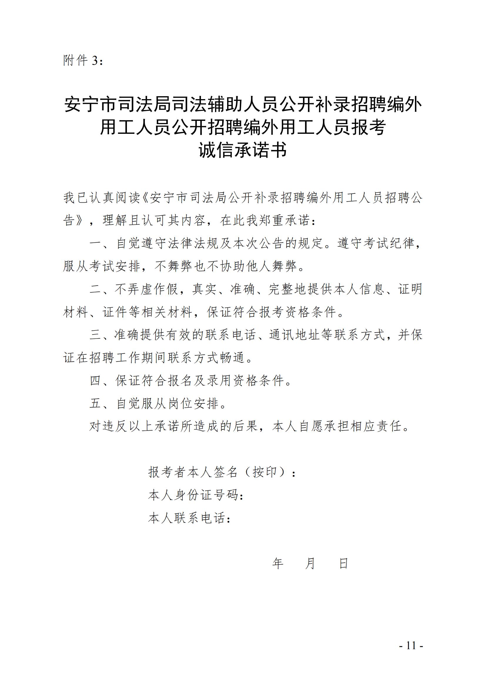 附件3:安寧市司法局司法輔助人員公開(kāi)補(bǔ)錄招聘編外用工人員公開(kāi)招聘編外用工人員報(bào)考誠(chéng)信承諾書(shū)。