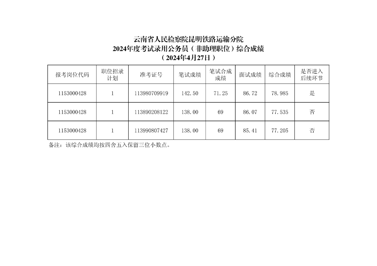 云南省人民檢察院昆明鐵路運(yùn)輸分院 2024年度考試錄用公務(wù)員(非助理職位)綜合成績(jī)