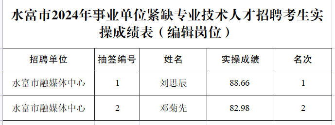 根據(jù)《昭通市2024年事業(yè)單位公開招聘優(yōu)秀緊缺專業(yè)技術(shù)人才實(shí)施辦法》和《水富市2024年事業(yè)單位公開招聘優(yōu)秀緊缺專業(yè)技術(shù)人才通告》的有關(guān)要求,水富市2024年事業(yè)單位公開招聘優(yōu)秀緊缺專業(yè)技術(shù)人才實(shí)操工作已于4月28日上午完成,現(xiàn)將實(shí)操成績予以公示,公示期為5個(gè)工作日。