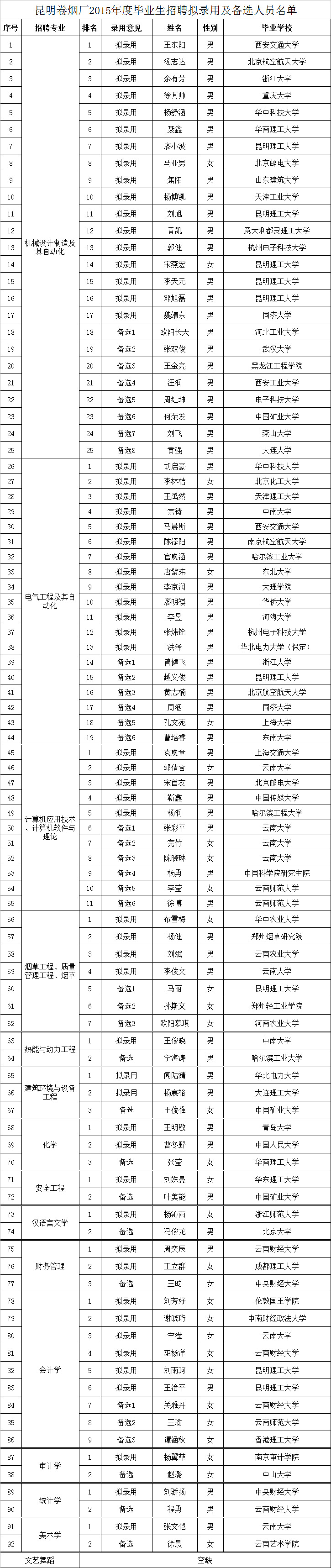 按照紅云紅河集團(tuán)2015年畢業(yè)生招聘計(jì)劃及相關(guān)安排,集團(tuán)招聘的各項(xiàng)程序已完成,根據(jù)考試成績(jī)排名,現(xiàn)將昆明卷煙廠擬錄用和備選人員名單進(jìn)行公示(若擬錄用人員放棄簽約,則按備選意見(jiàn)依次遞選錄用),詳見(jiàn)附件。