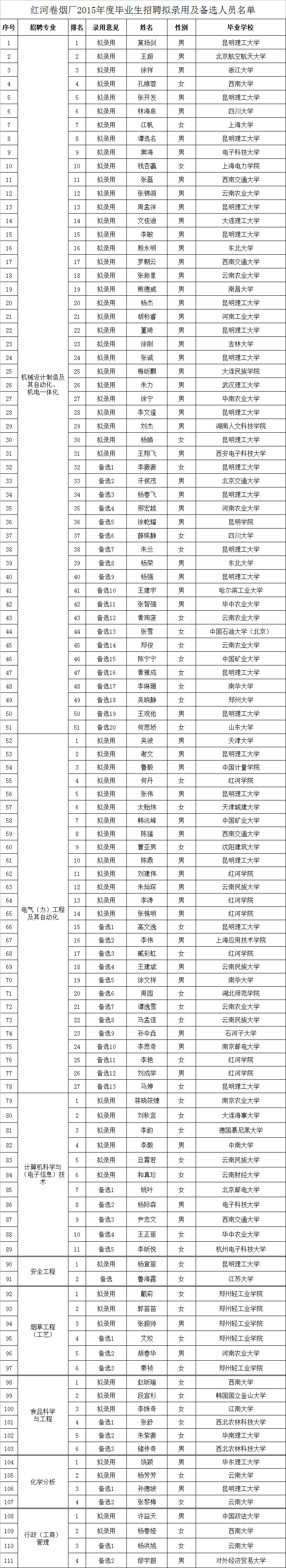 紅河卷煙廠擬錄用和備選人員公示