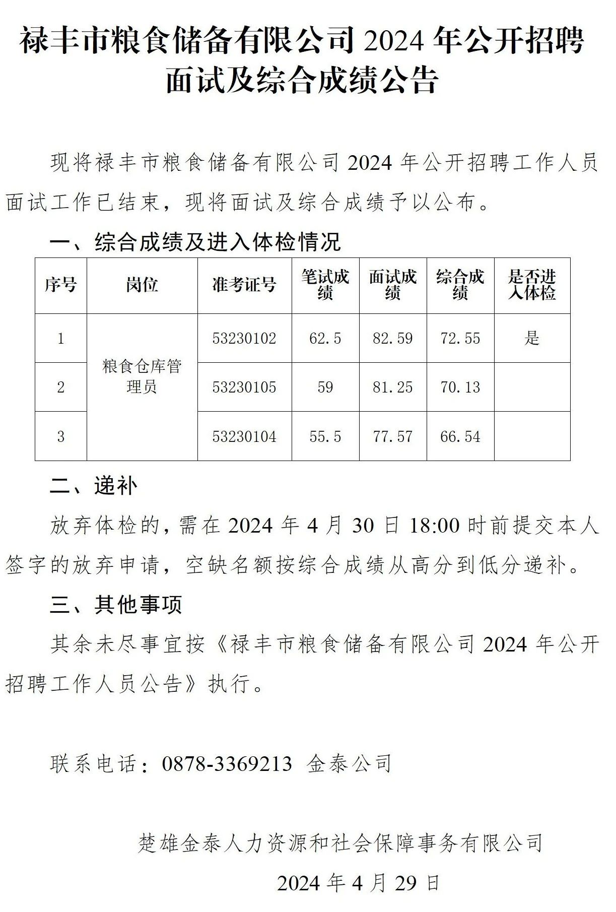 祿豐市糧食儲(chǔ)備有限公司2024年公開(kāi)招聘面試及綜合成績(jī)公告