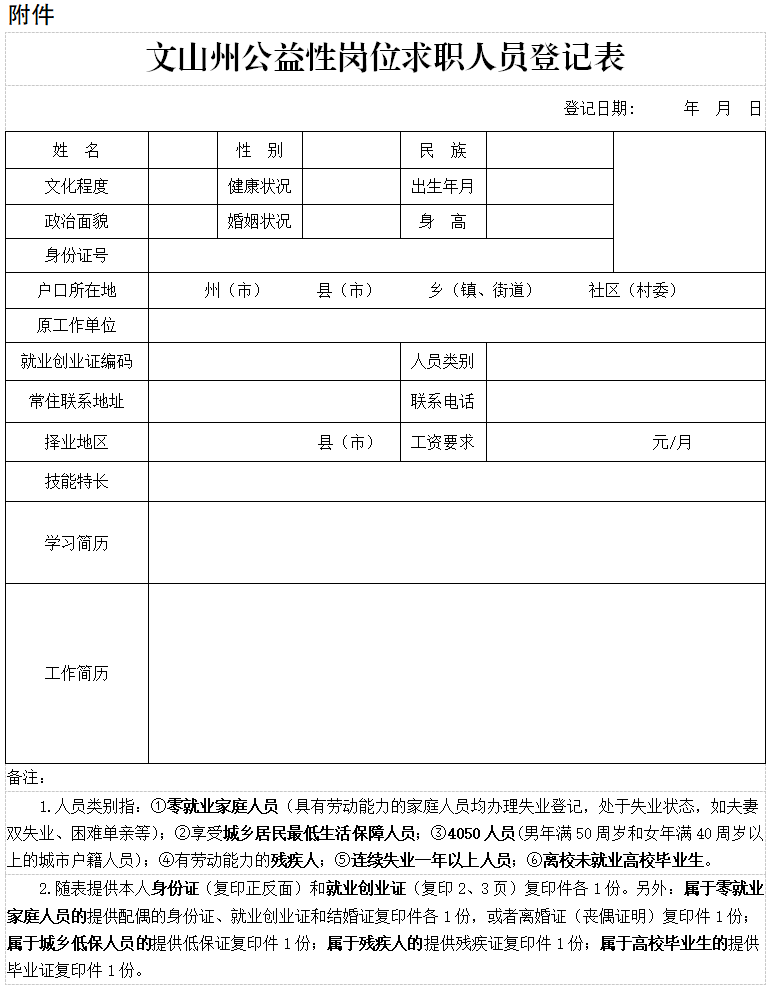 附件:《文山州公益性崗位求職人員登記表》