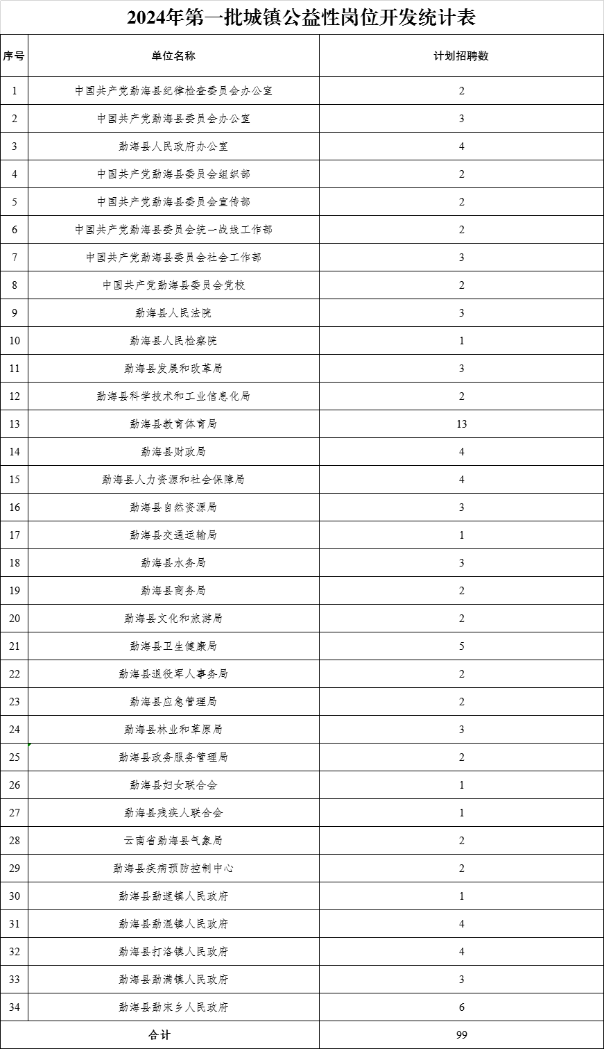 招聘崗位99個。具體招聘崗位數(shù)量詳見《勐??h2024年第一批城鎮(zhèn)公益性崗位開發(fā)統(tǒng)計表》。