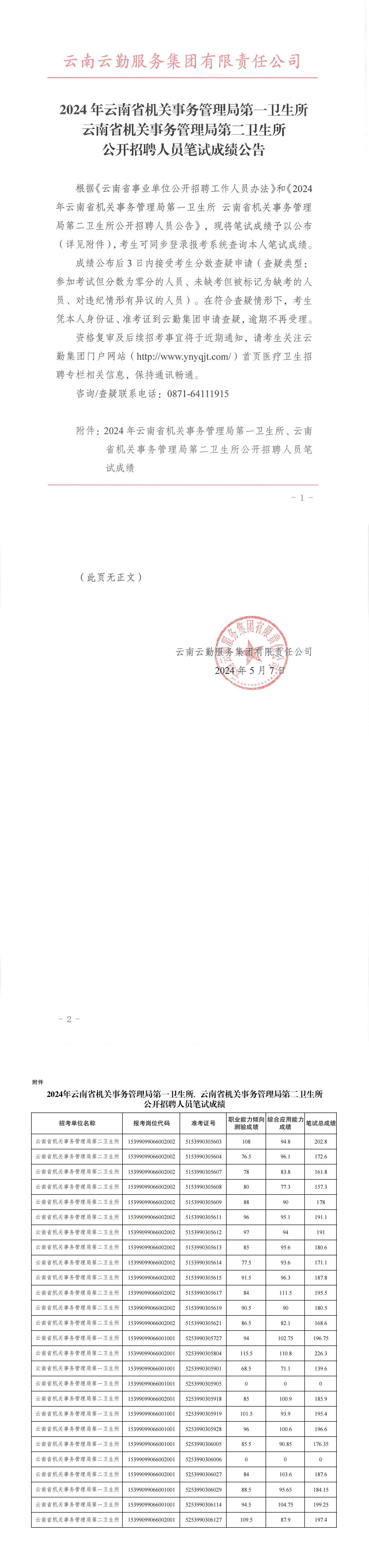 公開招聘人員筆試成績公告