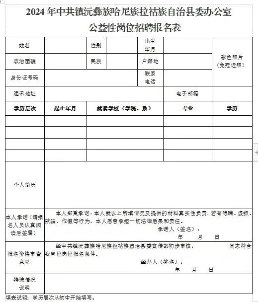 附件:2024年中共鎮(zhèn)沅縣委辦公室公益性崗位招聘報名表