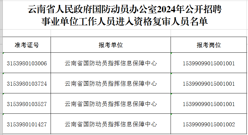 根據(jù)2024年1月26日發(fā)布的《2024年云南省人民政府國(guó)防動(dòng)員辦公室公開招聘人員公告》,現(xiàn)將資格復(fù)審人員名單及相關(guān)事項(xiàng)公告如下: