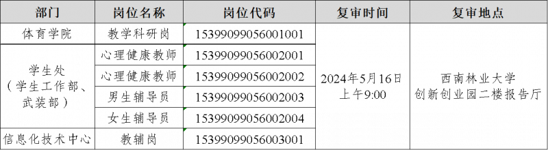 根據(jù)《云南省事業(yè)單位公開招聘工作人員辦法》(云人社發(fā)〔2016〕182號)和《2024年西南林業(yè)大學公開招聘碩士研究生公告》等有關規(guī)定及相關要求,相關招聘崗位經(jīng)過網(wǎng)絡報名、筆試等程序,即將開展資格復審和面試工作,現(xiàn)將有關事宜公告如下: