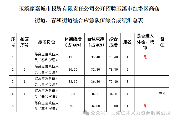 玉溪家嘉城市投資有限責(zé)任公司公開招聘玉溪市紅塔區(qū)高倉街道、春和街道綜合應(yīng)急隊(duì)伍綜合成績公示及進(jìn)入體檢、政審人員名單公布如下(公示期共3天,自2024年5月15日至5月17日):