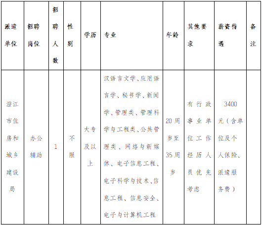 澄江市住房和城鄉(xiāng)建設(shè)局因工作需要,現(xiàn)委托澄江市啟澄人力資源有限責任公司,面向社會公開招聘辦公輔助工作人員1名,現(xiàn)將有關(guān)事項公告如下:
