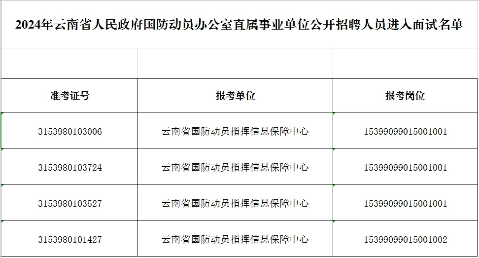 附件:2024年云南省人民政府國(guó)防動(dòng)員辦公室直屬事業(yè)單位公開(kāi)招聘人員進(jìn)入面試名單.xls