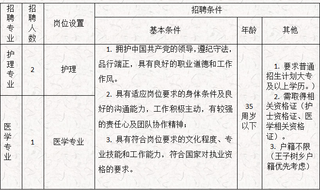 為適應王子樹衛(wèi)生健康事業(yè)發(fā)展工作需要,進一步充實王子樹鄉(xiāng)衛(wèi)生院隊伍建設,不斷提高醫(yī)療服務質量,更好的滿足廣大人民群眾健康需求,改善臨床科及護理人員緊缺狀況。隴川縣王子樹衛(wèi)生院面向社會公開招聘編外工作人員3人,現(xiàn)將有關招聘事宜公告如下: