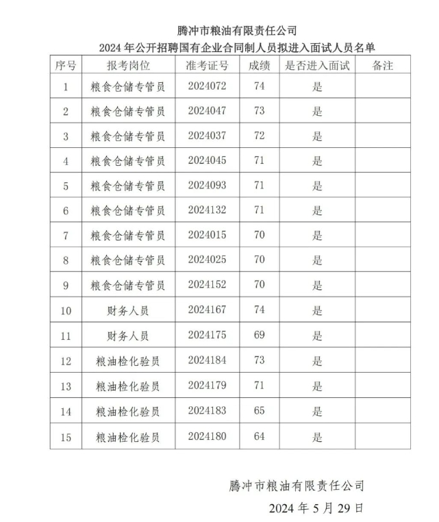 附件:騰沖市糧油有限責(zé)任公司2024年公開招聘國有企業(yè)合同制人員擬進(jìn)入面試人員名單